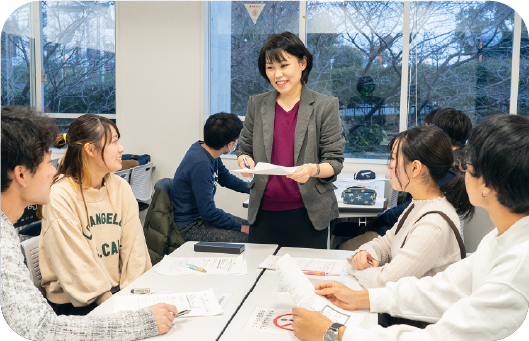 田園調布学園大学を選んだ理由で最も多いのが、「先生と学生の距離が近いから」。何でも話せる先生は私たちの自慢です!コミュニケーションの様子もぜひチェックしてください!
